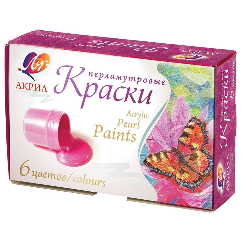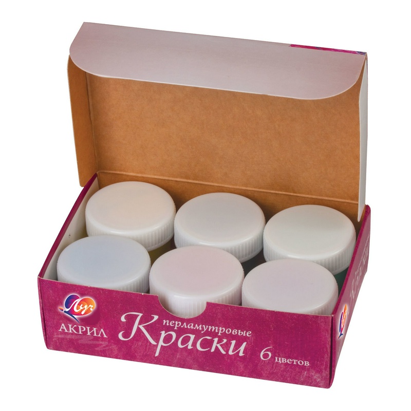 Набор акриловых красок Луч, перламутровые 6 цветов. На акриловой основе, в баночках с закручивающейся крышкой емкостью 15 мл. Без кисти. Преднозначены для нанесения на бумагу, картон, изделия из дерева, гипса, керамики. После высыхания образует водостойкий слой. Быстро сохнут, равномерно наносятся, приобретая глянцевую поверхность, не образует трещин после высыханияне, прекрасно смешиваются между собой. 382860
