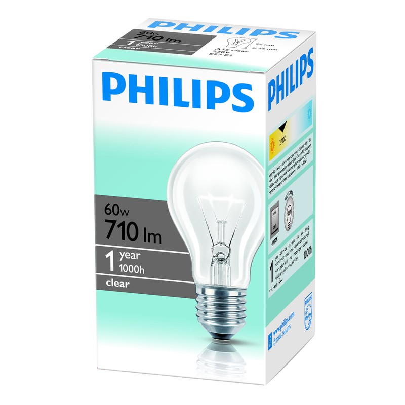 Лампа накаливания Philips, стандартная прозрачная, 60Вт, цоколь E27