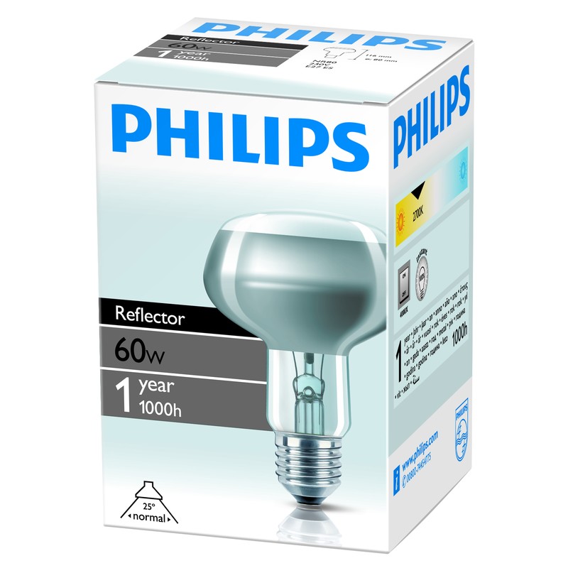 Лампа накаливания Philips. Мощность 60 Вт, цоколь E27, зеркальная. Форма колбы: грибок. 96663