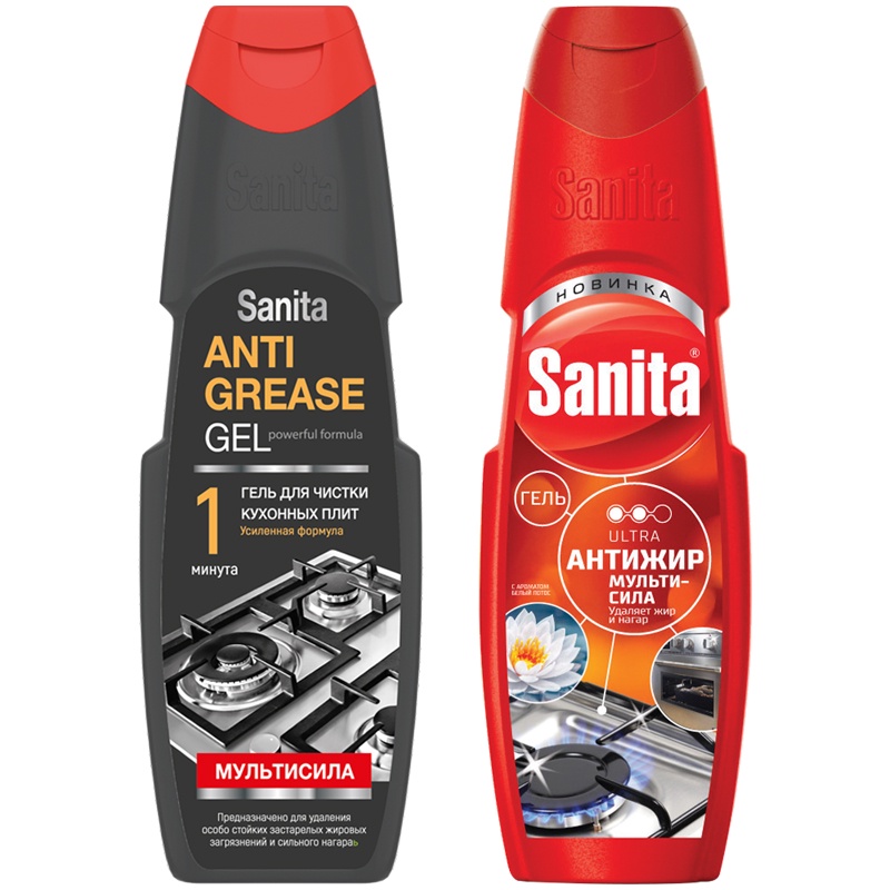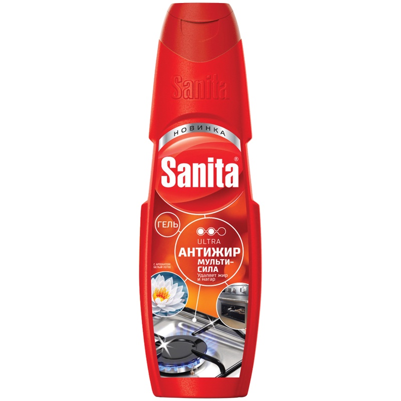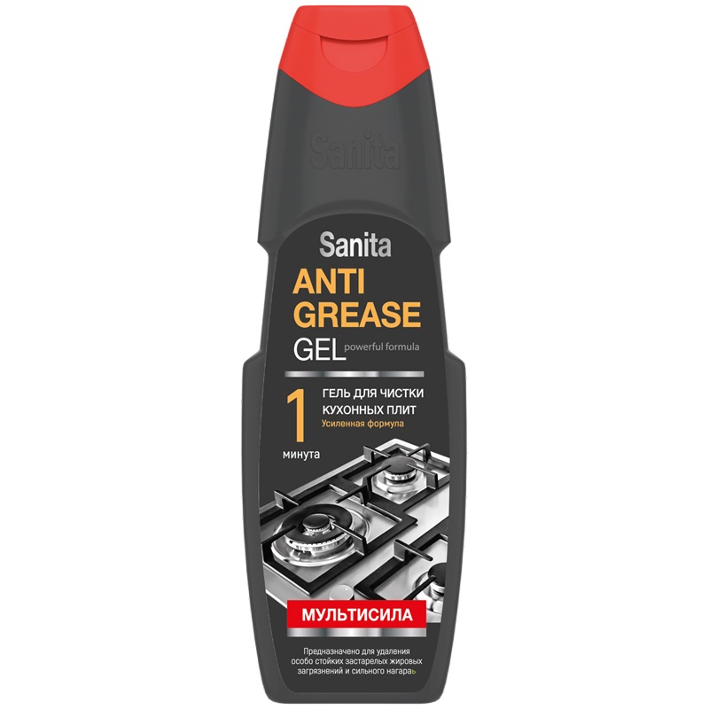 Чистящее средство для плит Санита Антижир гель 500 мл. Предназначено для удаления жировых загрязнений с кухонных плит, микроволновых печей, грилей, духовых шкафов, а также для мытья полов на кухне. Эффективно обеззараживает, обеспечивает чистоту и сияние. Средство замерзает, после размораживания сохраняет свои свойства. Торговая марка: Санита. Состав: > 5%, но < 15% щелочь, <5% АПАВ, < 5%: краситель, ароматизирующая добавка.