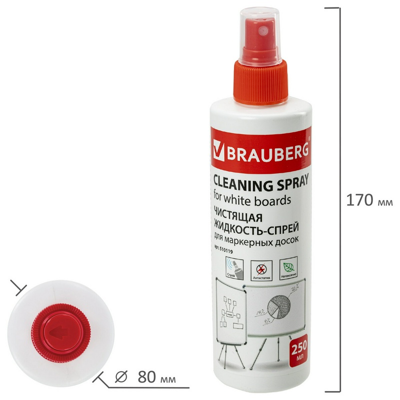 Спрей-очиститель для маркерных досок BRAUBERG 510119 для маркерных досок, 250 мл. Предназначен для очистки поверхности маркерных досок. Удаляет следы маркерных разводов, дезинфицирует поверхность. Обладает антистатическим эффектом. 510119