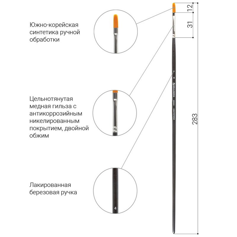 Кисть художественная профессиональная BRAUBERG ART "CLASSIC" 200664, синтетика жесткая, плоская, №4, длинная ручка. Диаметр (ширина) кисти: 4 мм. Выход волоса: 12 мм. Изготовлена из высококачественной южно-корейской синтетики. Синтетика превосходит щетину в сохранении формы мазка, легкости очистки и износостойкости. Предназначена для работ густыми красками: гуашь, акрил, масло, темпера. Идеальна для водорастворимых масляных красок.