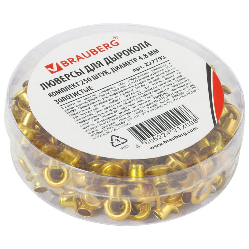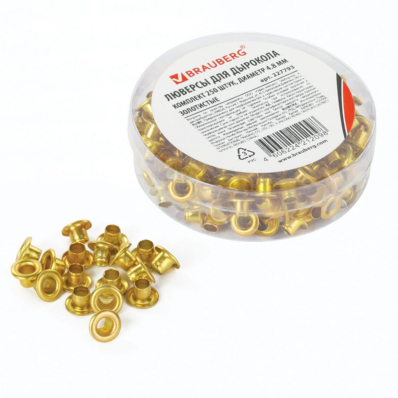 Люверсы BRAUBERG 227793, внутренний диаметр 4,8 мм, длина 4,6 мм, золотистые. Для защиты отверстий от механического повреждения (разрыва, износа) при сшивания бумаги, картона, баннерной ткани.Также подходят для скрапбукинга. Материал: металл. В упаковке 250 штук. 227793