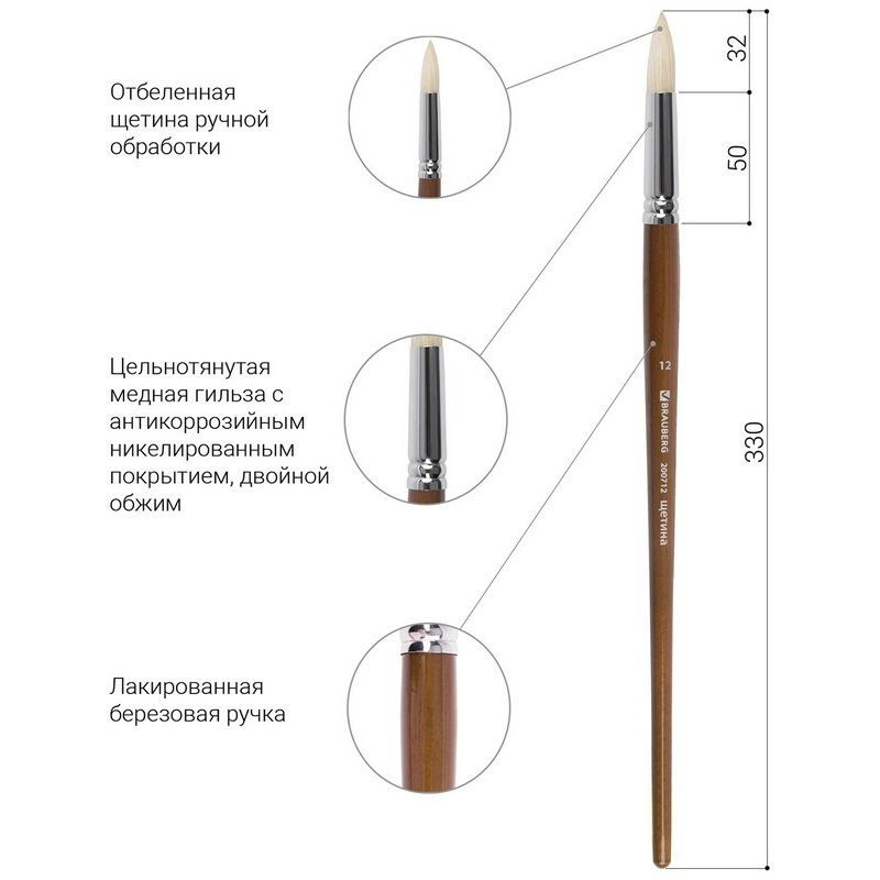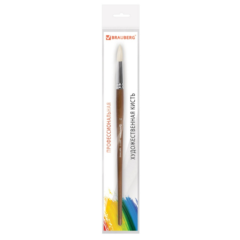 Кисть художественная профессиональная BRAUBERG 200712 ART "CLASSIC", щетина, круглая, № 12, длинная ручка