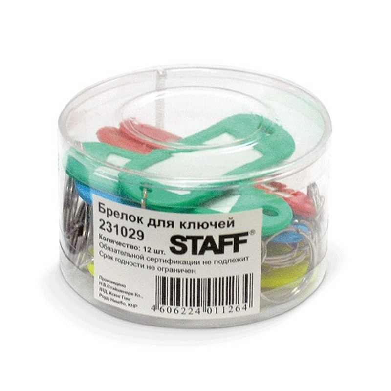 Бирки для ключей пластиковые STAFF 231029, 12 штук в упаковке, цвет ассорти. Длина брелока: 60 мм. Ширина брелока: 24 мм. Длина инфо-окна: 35 мм. Ширина инфо-окна: 15 мм. Набор разноцветных брелоков позволит идентифицировать ключи от разных кабинетов. 231029