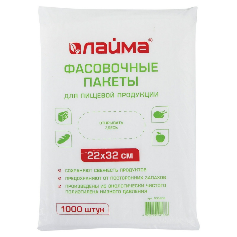 Фасовочные пакеты ЛАЙМА предназначены для упаковки различной продукции, в том числе пищевой. Отлично подходят для овощей, фруктов, зелени. Обладают высокой эластичностью, сохраняют свежесть продуктов, предохраняют содержимое от посторонних запахов. Изготовлены из экологически чистого полиэтилена низкого давления. 1000 сложенных стопкой пакетов в евроупаковке. 605958