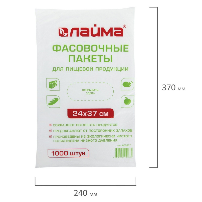 Фасовочные пакеты ЛАЙМА предназначены для упаковки различной продукции, в том числе пищевой. Отлично подходят для овощей, фруктов, зелени. Обладают высокой эластичностью, сохраняют свежесть продуктов, предохраняют содержимое от посторонних запахов. Изготовлены из экологически чистого полиэтилена низкого давления. 1000 сложенных стопкой пакетов в евроупаковке. 605957