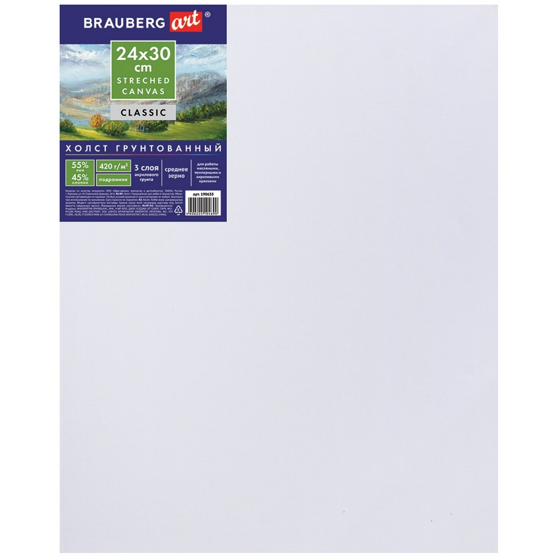 Холст на подрамнике BRAUBERG ART "CLASSIC", 24х30 см, грунтованный, 45% хлопок, 55% лен, среднее зерно, 190635
