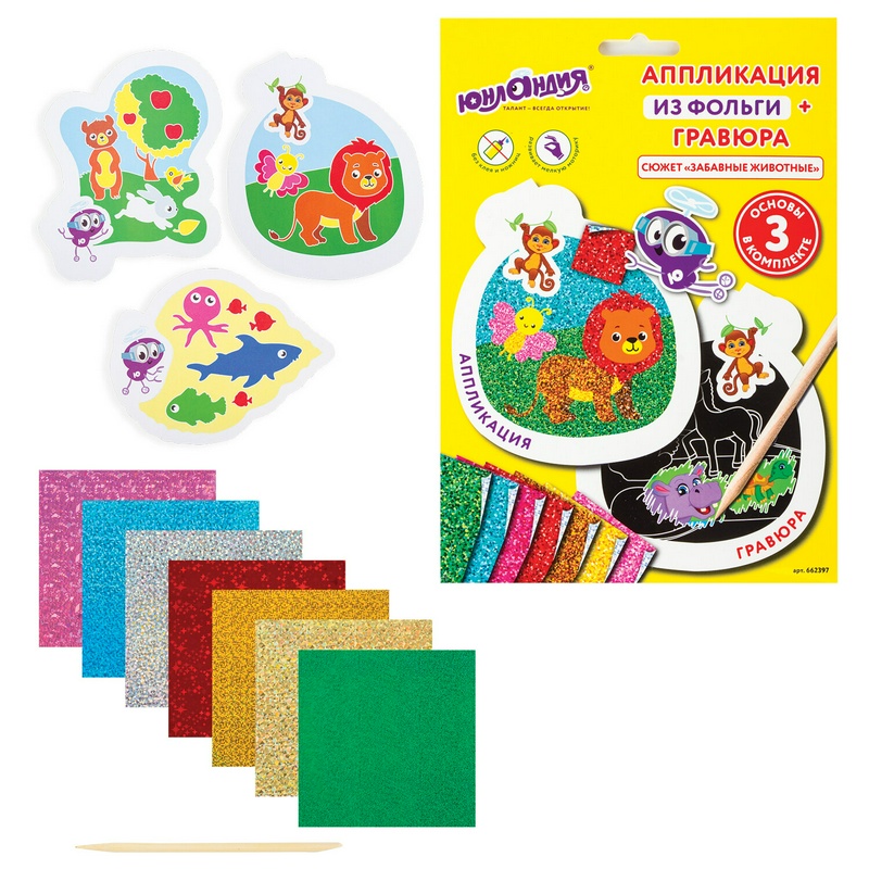 Гравюра-аппликация ЮНЛАНДИЯ "Забавные животные" - это необычное увлекательное занятие, которое способствует развитию мелкой моторики, воображения и фантазии! Для создания аппликации не требуются ножницы и клей, все необходимые элементы входят в набор. 662397