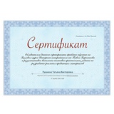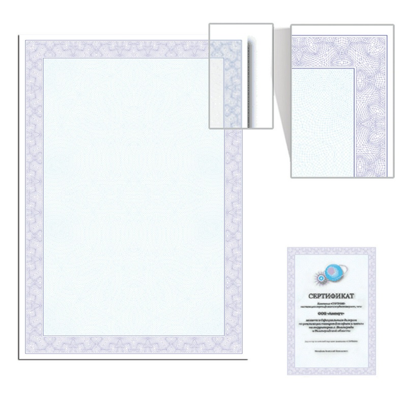 - Бумага формата А4 (210х297 мм) выполнена из импортной мелованной бумаги плотностью 115 г/м2. Имеет вертикальную ориентацию. Микропечать защитит документ от копирования. Лицевая сторона украшена рамкой фиолетового цвета. Поставляется по 25 листов в термоусадочной пленке.
