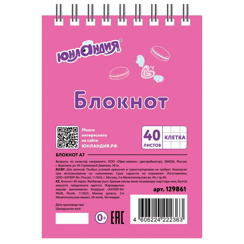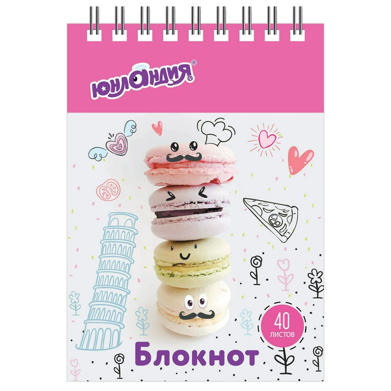 Блокнот ЮНЛАНДИЯ "ВКУСНОСТИ" - это простой и удобный способ записать, структурировать и запомнить нужную информацию. В нем также можно делать рисунки и эскизы, сохранять фотографии, билеты и другие мелочи. - Блокнот формата А7 на евроспирали содержит 40 листов с линовкой в клетку. Имеет верхнее расположение переплета. Обложка выполнена из мелованного картона плотностью 200 г/м2. Внутренний блок состоит из белой офсетной бумаги плотностью 60 г/м2.