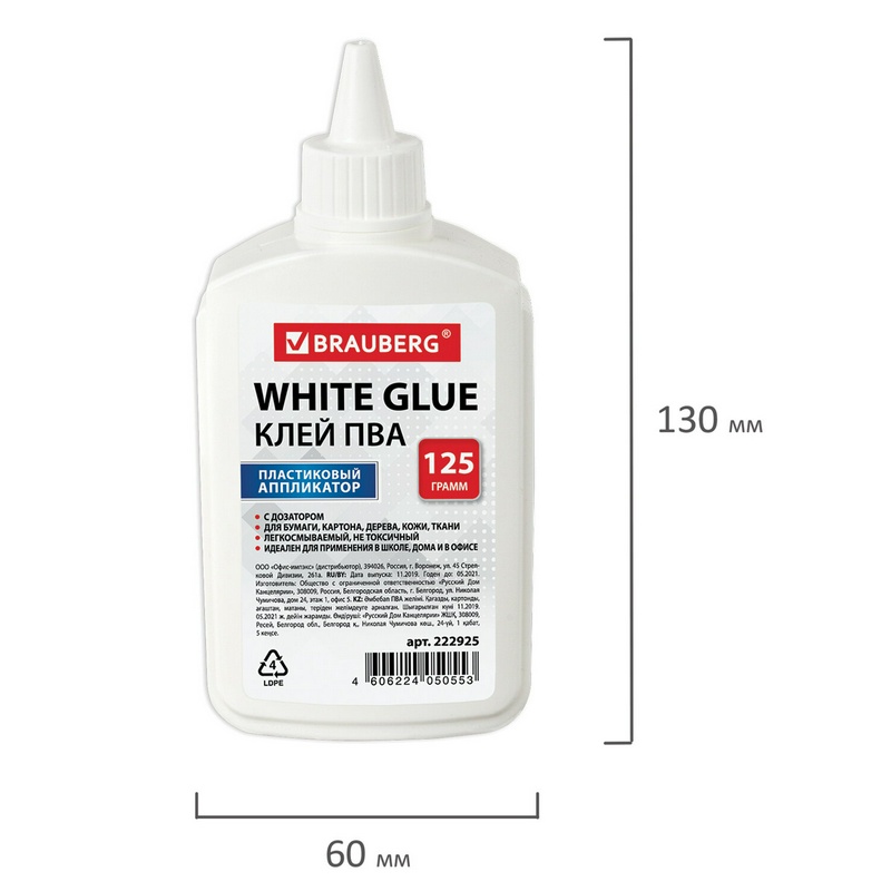 Клей ПВА BRAUBERG предназначен для склеивания бумаги, картона, дерева. - Имеет объем 125 мл. Пластиковый дозатор обеспечивает точное и равномерное нанесение. Обладает устойчивостью к морозу, не токсичен. Наносится тонким слоем, обеспечивая быстрое схватывание поверхностей, а также экономичное расходование. Съемный колпачок предохраняет клей от засыхания. Необходимо взболтать перед применением.