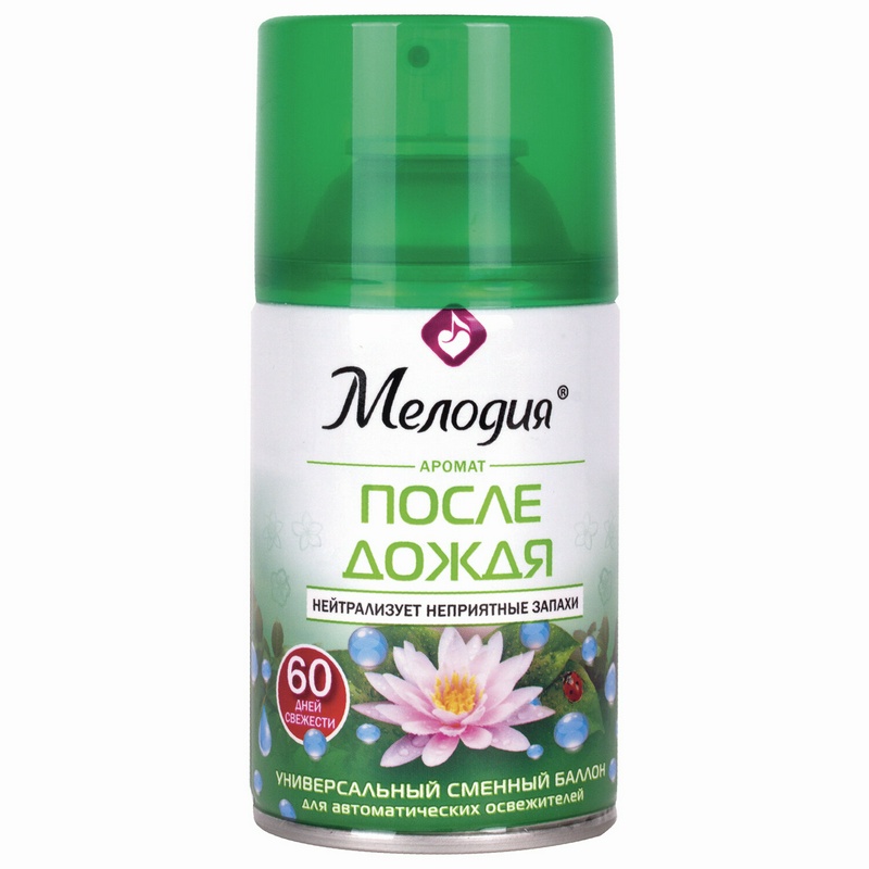 Сменный баллон МЕЛОДИЯ "После дождя" быстро и эффективно устраняет неприятные запахи и освежает воздух в жилых и бытовых помещениях. Имеет приятный стойкий аромат, который надолго наполнит помещение свежестью.