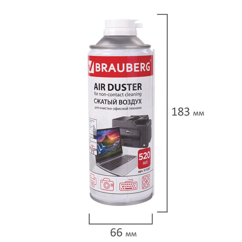 Баллон со сжатым воздухом BRAUBERG предназначен для бесконтактного удаления пыли и мелкого мусора из труднодоступных мест и внутреннего пространства компьютерной техники, аудио-, видео- и фотоаппаратуры, офисной и бытовой техники.