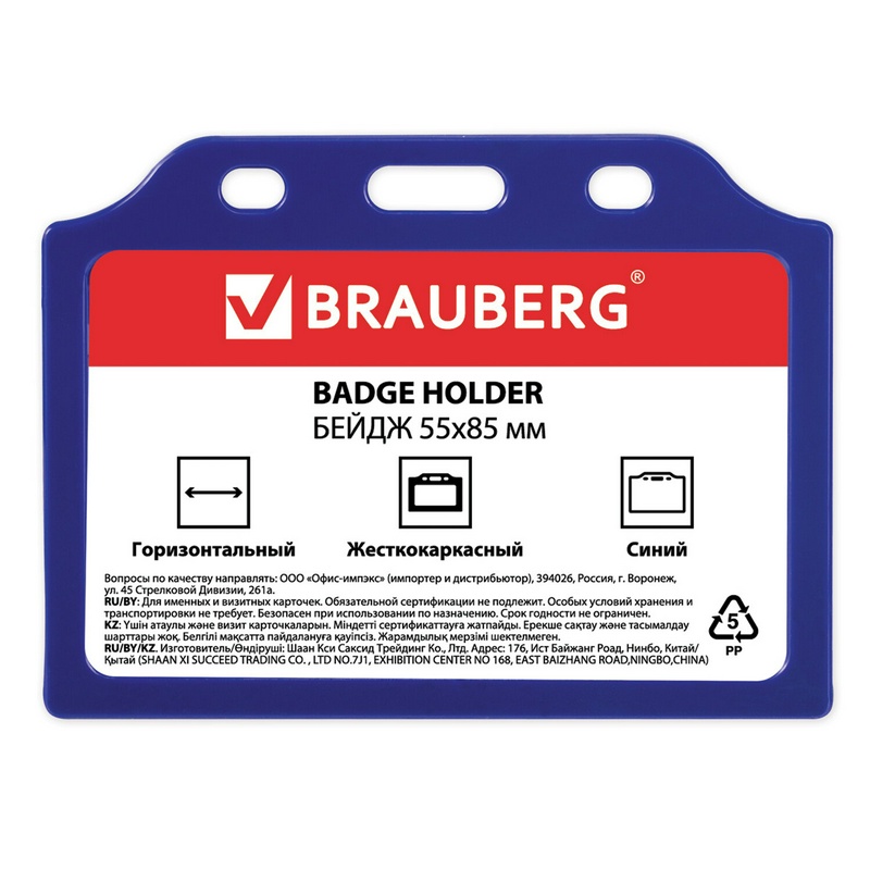 Бейдж горизонтальный жесткокаркасный (55х85 мм), без держателя, СИНИЙ, BRAUBERG, 235740