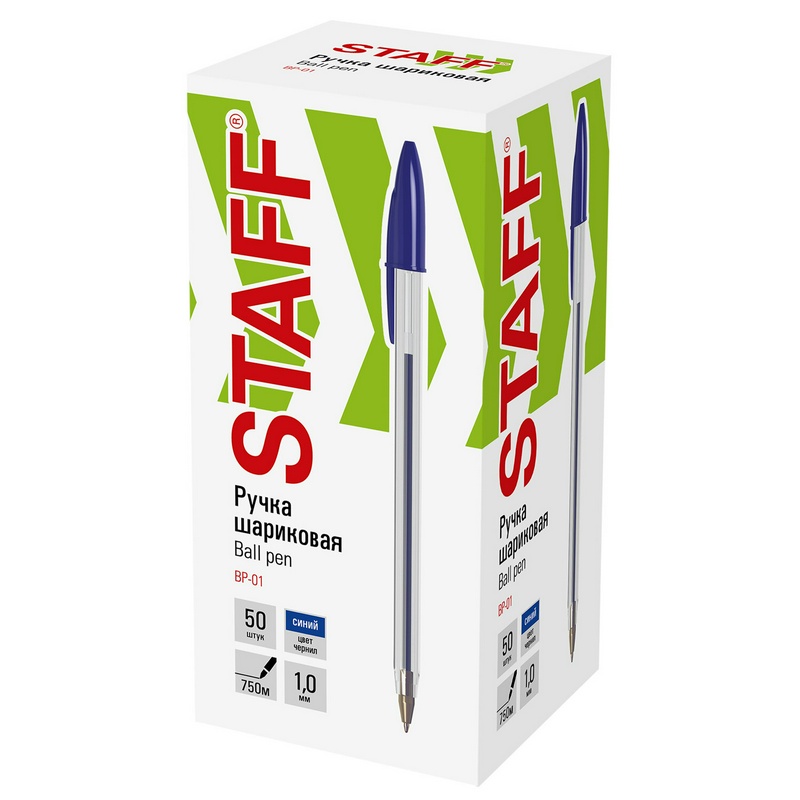 Ручка шариковая STAFF "Basic BP-01", письмо 750 метров, СИНЯЯ, длина корпуса 14 см, линия письма 0,5 мм, 141672