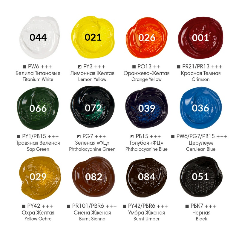 В наборе 12 цветов:белила титановые (044); - лимонная желтая (021); - оранжево-желтая (026); - красная темная (001); - травяная зеленая (066); - зеленая "ФЦ" (072); - голубая "ФЦ" (039); - церулеум (036); - охра желтая (029); - сиена жженая (082); - умбра жженая (084); - черная (051).