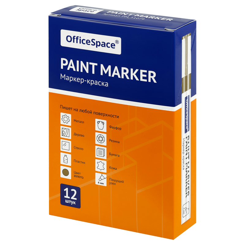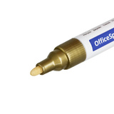 Маркер-краска OfficeSpace с чернилами на нитро-основе подходит для использования на металлических, деревянных, стеклянных и пластиковых поверхностях. Цвет – золотой. Закругленный пишущий узел оставляет линии шириной 1-4 мм. Длина непрерывной линии – 600 метров. Металлический корпус. Маркеры упакованы по 12 штук в картонную коробку, которую можно использовать в качестве мини-витрины.