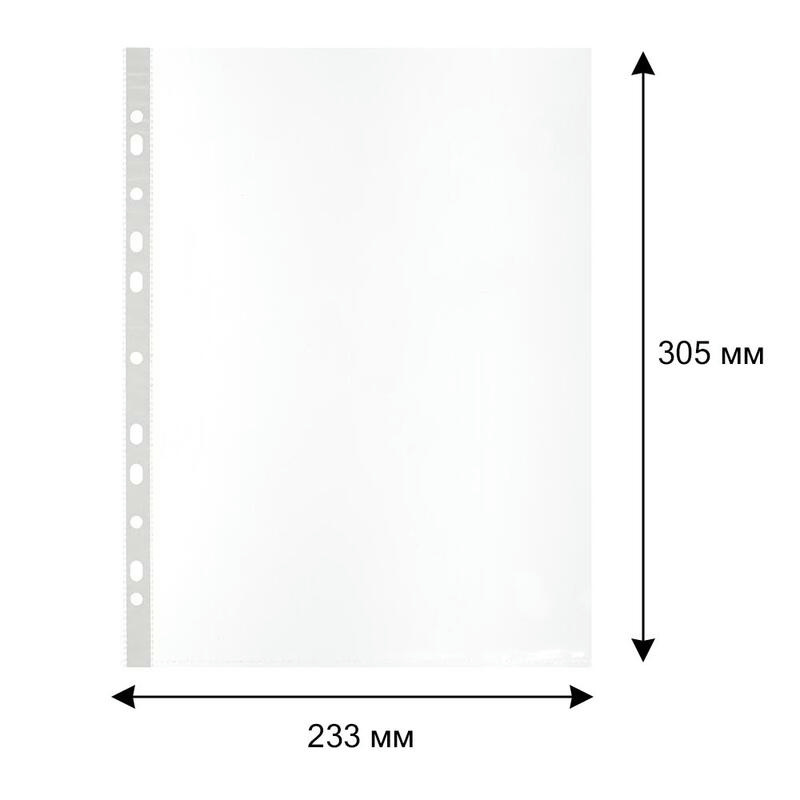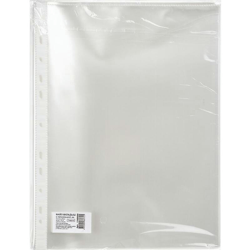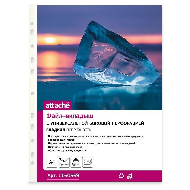 Файл-вкладыш Attache формата А4, предназначенный для хранения и защиты печатных документов. Поверхность прозрачная, глянцевая. Изготовлен из полипропиленовой пленки (плотность 80 мкм). Внешний размер: 233+2x305+2 мм, внутренний размер: 217+2x303+2 мм. Боковая перфорация подходит для разных типов скоросшивателей. В упаковке содержится 100 файлов. Каждый файл-вкладыш вмещает около 50 листов стандартной плотности. Стоимость указана за упаковку. В рамках обновления дизайна упаковки с сохранением всех потребительских характеристик товара, допускается поставка данной продукции в двух вариантах дизайна упаковки.