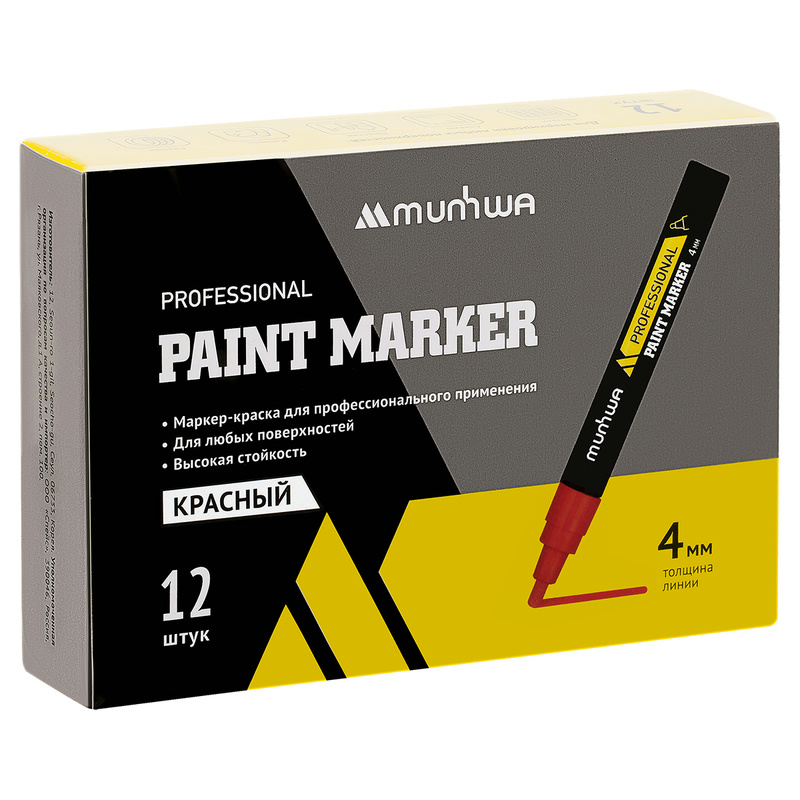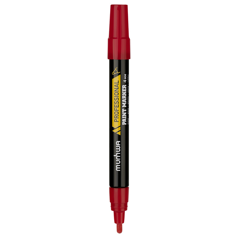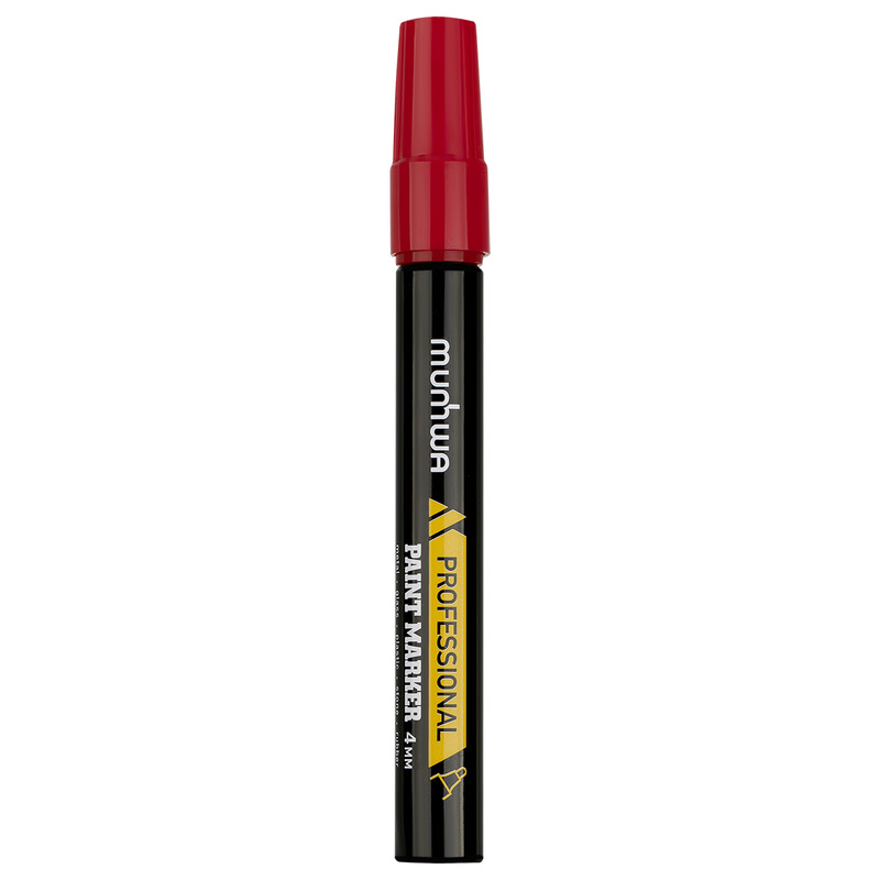 Professional Paint Marker — профессиональный лаковый маркер-краска от корейского бренда MunHwa. Высокопрочный лёгкий алюминиевый корпус предназначен для использования на производствах. Он выдерживает высокие нагрузки и не деформируется. Пишущий узел ударопрочен, устойчив к истиранию. Толщина линии — 4 мм. Цвет чернил — красный.