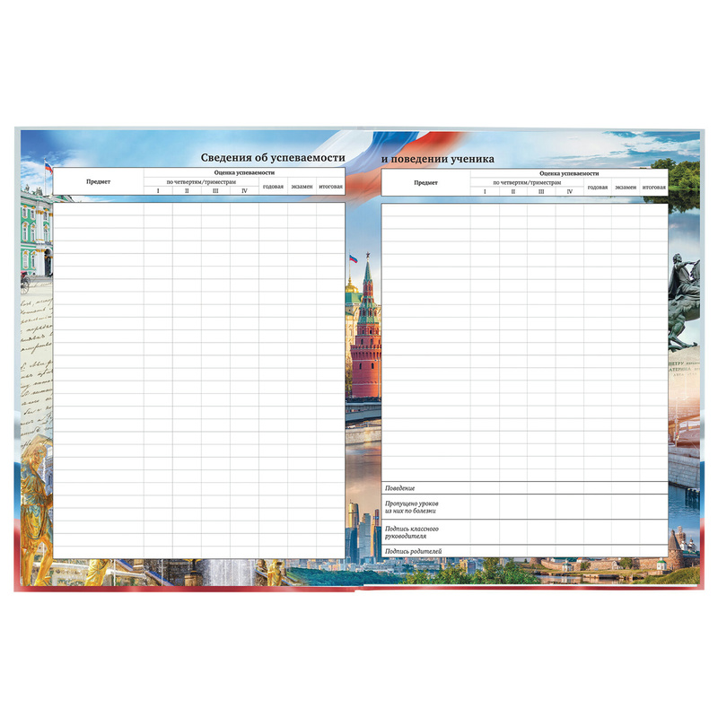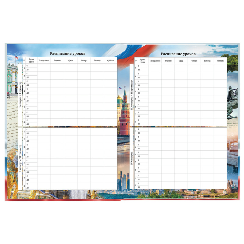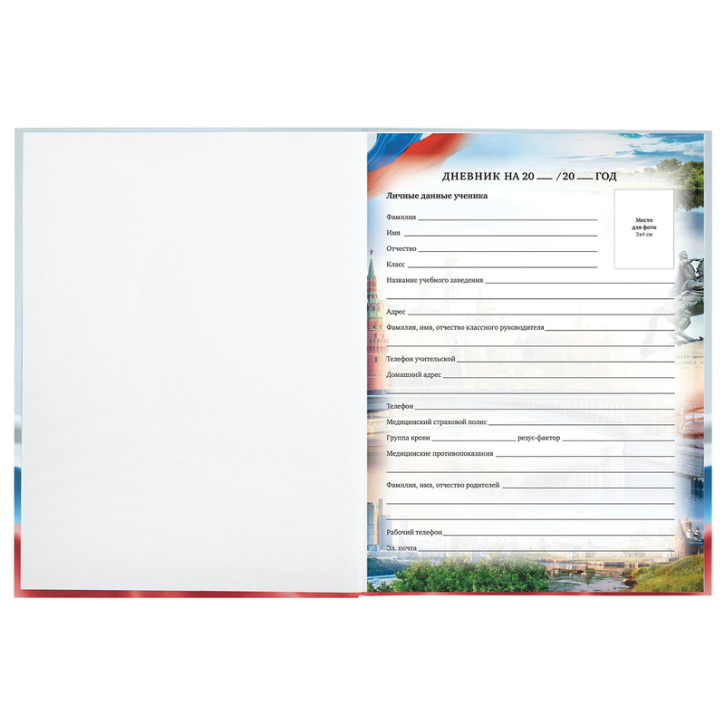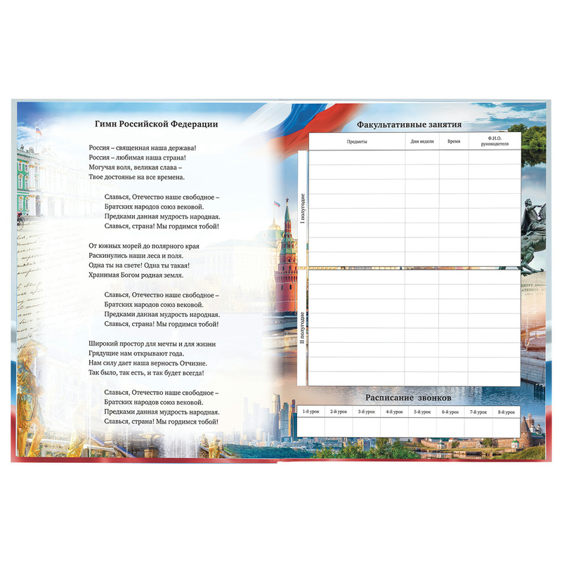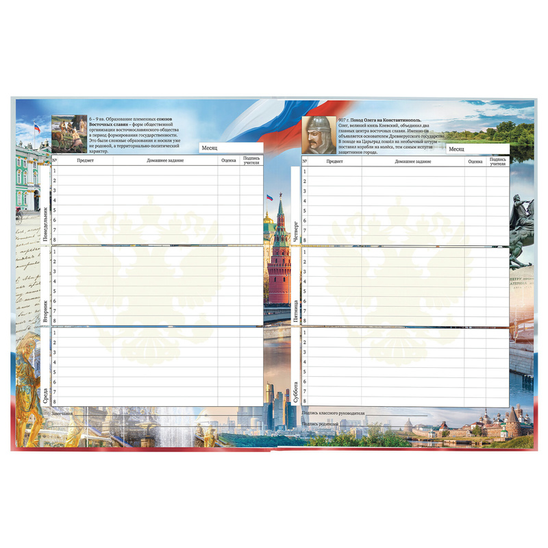 Предназначен для учащихся 1-11 классов. Твердая обложка надежно защищает внутренний блок и долго сохраняет привлекательный внешний вид дневника. Благодаря глянцевой ламинации краски на изображении становятся более яркими и насыщенными, исключается возможное истирание рисунка. Внутренний блок содержит 40 листов и состоит из офсетной белой бумаги плотностью 65 г/м2. На каждом листе внутреннего блока содержится историческая справка.