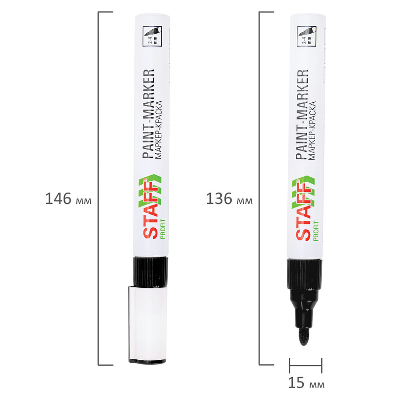 СПОСОБ ПРИМЕНЕНИЯ: 1. Перед использованием хорошо встряхнуть с закрытым колпачком. 2. Снять колпачок, надавить наконечником на поверхность. 3. Подождать 20 секунд, когда краска полностью пропитает наконечник. 4. После использования плотно закрыть колпачок. Высококачественные чернила черного цвета с лаковым эффектом идеально подходят для нанесения долговечной маркировки на любые поверхности. Благодаря усиленной формуле чернил краска ложится ровным слоем, полностью закрашивая поверхность. С помощью круглого прочного наконечника, выполненного из пористого акрила с шириной линии письма 2-4 мм, можно легко наносить широкие линии равномерным и однородным слоем. Быстросохнущие чернила предотвращают смазывание в процессе маркировки. После высыхания надписи становятся термо- и водостойкими, а также устойчивыми к выцветанию и механическому истиранию. Отлично подходит для маскировки бытовых дефектов, таких как царапины и сколы. Надежный помповый механизм подачи чернил предотвращает вытекание и разбрызгивание в процессе использования, а также преждевременное высыхание. Корпус маркера выполнен из алюминия, внутри находятся 2 металлических шарика для взбалтывания краски. Цвет колпачка соответствует цвету чернил. Это товар эконом-сегмента, поэтому он отличается привлекательной ценой. Товар обладает базовым набором характеристик и простой упаковкой, при этом полностью соответствует основным требованиям потребителей.