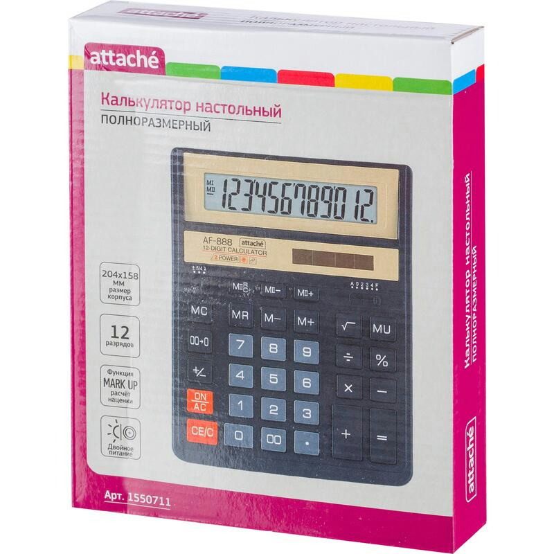 Калькулятор Attache AF-888 настольный в пластиковом корпусе с 12-разрядным дисплеем. Эргономичная форма и крупные клавиши создают максимальный комфорт в использовании. Корпус сделан в чёрном цвете.Оптимальный набор функций поможет автоматизировать расчёты: вычисление квадратного корня, расчёт наценки, коррекция последнего введённого значения, кнопка «00», двойная память, расчёт процентов и функция автоотключения (через 10 минут). Калькулятор незаменим для бухгалтеров благодаря наличию клавиш двойной памяти, «00» и MU для расчётов налогов и торговой наценки. Большой двенадцатиразрядный дисплей отображает большие значения с высокой точностью округления.В калькуляторе имеется два источника питания: солнечная батарея и батарейка G10 (не подлежит замене), а также есть место для установки батареи AA (не входит в комплект). Размер: 204×158×40 мм. Тип клавиатуры: пластик. Наличие металлической панели: есть.Перед применением необходимо снять защитную плёнку с металлической панели.Внешний вид и/или характеристики товара могут быть изменены производителем в соответствии с производственным процессом.