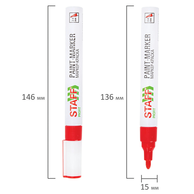 СПОСОБ ПРИМЕНЕНИЯ: 1. Перед использованием хорошо встряхнуть с закрытым колпачком. 2. Снять колпачок, надавить наконечником на поверхность. 3. Подождать 20 секунд, когда краска полностью пропитает наконечник. 4. После использования плотно закрыть колпачок. Высококачественные чернила красного цвета с лаковым эффектом идеально подходят для нанесения долговечной маркировки на любые поверхности. Благодаря усиленной формуле чернил краска ложится ровным слоем, полностью закрашивая поверхность. С помощью круглого прочного наконечника, выполненного из пористого акрила с шириной линии письма 2-4 мм, можно легко наносить широкие линии равномерным и однородным слоем. Быстросохнущие чернила предотвращают смазывание в процессе маркировки. После высыхания надписи становятся термо- и водостойкими, а также устойчивыми к выцветанию и механическому истиранию. Отлично подходит для маскировки бытовых дефектов, таких как царапины и сколы. Надежный помповый механизм подачи чернил предотвращает вытекание и разбрызгивание в процессе использования, а также преждевременное высыхание. Корпус маркера выполнен из алюминия, внутри находятся 2 металлических шарика для взбалтывания краски. Цвет колпачка соответствует цвету чернил. Это товар эконом-сегмента, поэтому он отличается привлекательной ценой. Товар обладает базовым набором характеристик и простой упаковкой, при этом полностью соответствует основным требованиям потребителей.