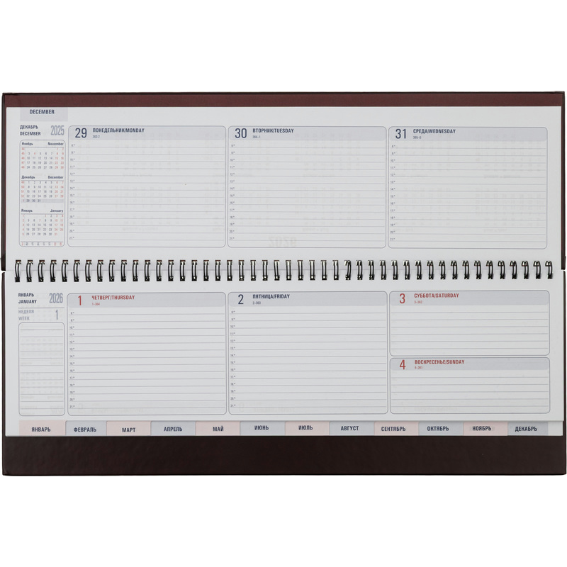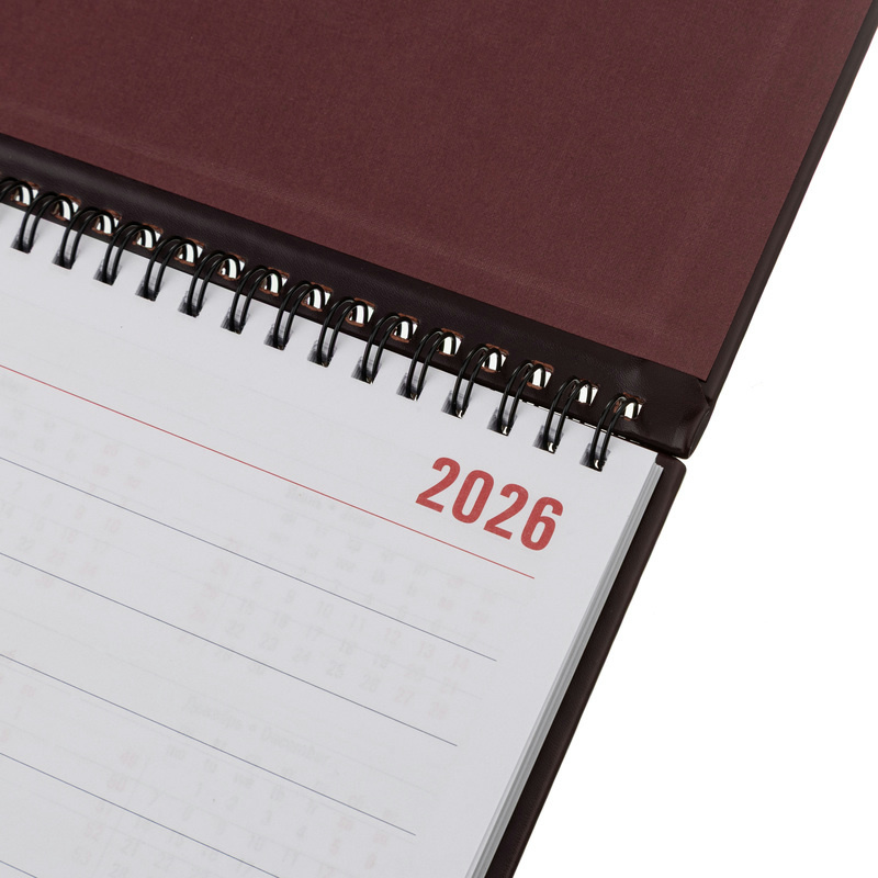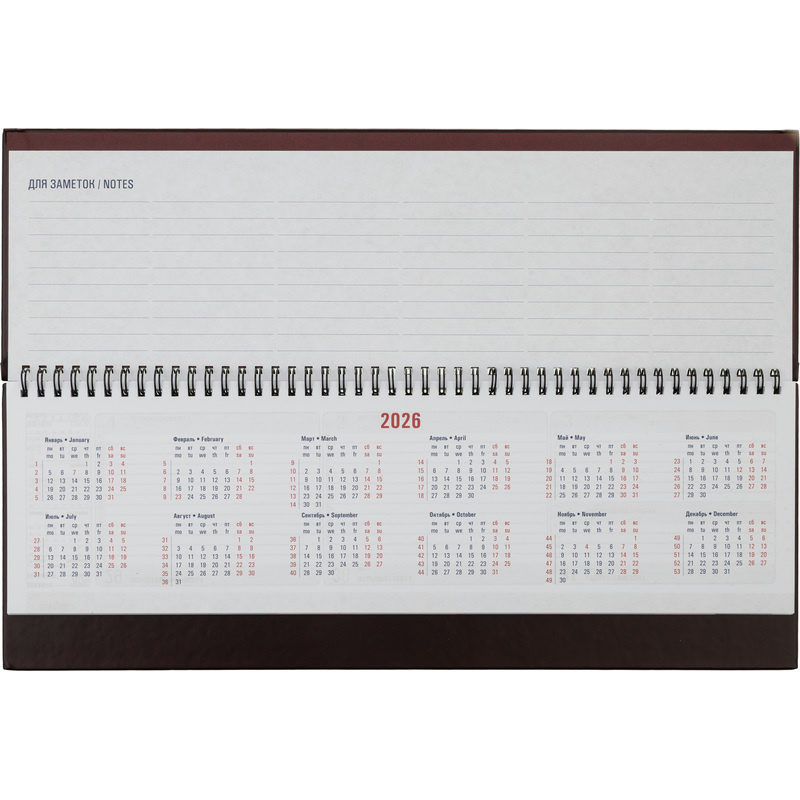 Планинг датированный на 2026 год. Формат: 405×145 мм. Цвет: бордовый. Блок 110 страниц (55 листов) в 2 краски. Бумага офсетная 70 г/кв.м. Календарь на 2025-2026 г. Вырубка блока по месяцам. Твердая обложка выполнена из искусственной кожи высокого качества. Возможно нанесение логотипа на обложку, любым способом тиснения (блинт или фольга).
