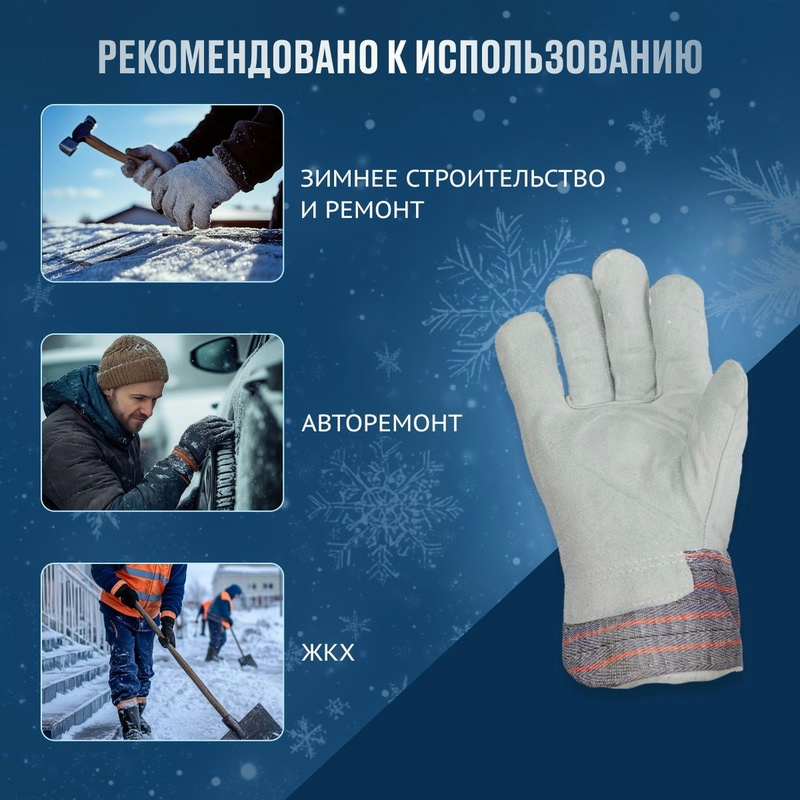 Перчатки рабочие утеплённые комбинированные серые (размер 10.5, XXL)Перчатки рабочие утеплённые комбинированные серые обеспечивают эффективную защиту от механических нагрузок и низких температур. Сфера применения перчаток: строительная отрасль, ремонтные работы и сфера ЖКХ. Они подходят для использования в холодных условиях, где требуется защита от низких температур и механических повреждений. Условия рабочей среды: сухие. В упаковке одна пара.Перчатки изготовлены из комбинированных материалов: верхняя часть выполнена из плотной хлопковой ткани с мягким спилком КРС, который обеспечивает высокую стойкость к истиранию и разрыву. Ладонная часть состоит из двух частей и покрыта спилком сорта В (толщина 1,1 +/— 0,1 мм) серого цвета. Внутренняя подкладка изготовлена из специального искусственного меха белого цвета плотностью 450 г/кв.м, который создаёт комфортный микроклимат и защищает руки от морозов.Благодаря продуманной конструкции и эргономичной подкладке перчатки обеспечивают свободу движений пальцев и рук, сохраняя комфорт даже при длительном использовании. Манжеты-краги из хлопковой ткани добавляют удобство и надёжность при работе. Стандарты: ТР ТС 019/2011, ГОСТ 12.4.252-2013. Эксплуатационный уровень: EN 388-2123, EN 511-11X. Расшифровка уровня: — Стойкость к истиранию: уровень 2 ( 500 циклов).— Стойкость к порезу: уровень 1 (индекс 1,2).— Стойкость к разрыву: уровень 2 (25 Н).— Стойкость к проколу: уровень 3 ( 50 Н).— Конвективный холод. Теплоизоляция.— 1 ( 0,10).— Контактный холод. Тепловое сопротивление. 1 (0,1). Внешний вид и/или характеристики товара могут быть изменены производителем в соответствии с производственным процессом.