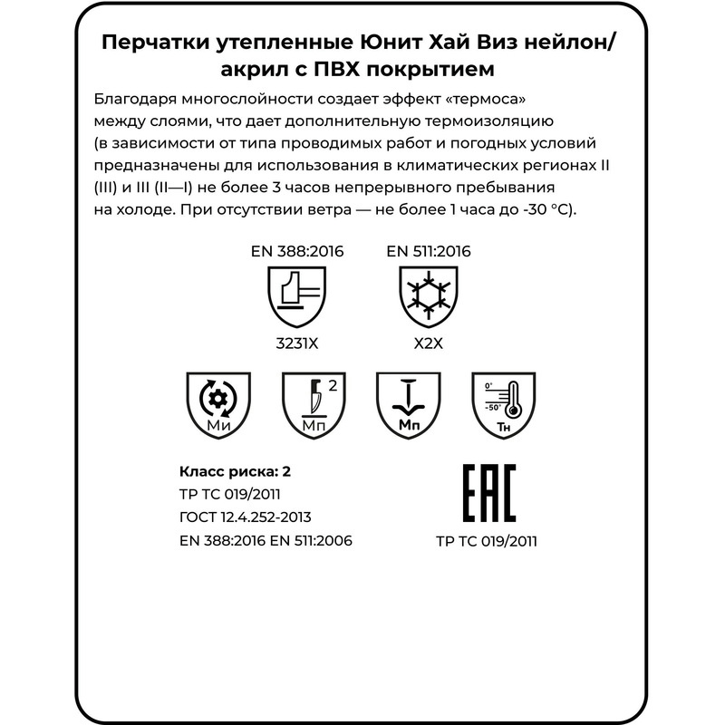 Перчатки рабочие утеплённые Manipula Specialist Юнит Хай Виз нейлоновые с ПВХ покрытием жёлтые/чёрные (7 нитей, 14 класс вязки, размер 11, XXL)Перчатки разработаны для обеспечения надёжной защиты рук в условиях экстремально низких температур, механических нагрузок и контакта с нефтью и нефтепродуктами. Благодаря своей конструкции они сохраняют гибкость и эластичность даже при температурах до −50°C,