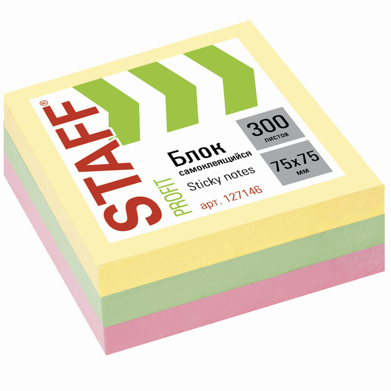 Блок самоклеящийся (стикеры) STAFF "PROFIT" 75×75мм, 300 листов, 3 цвета, 127146