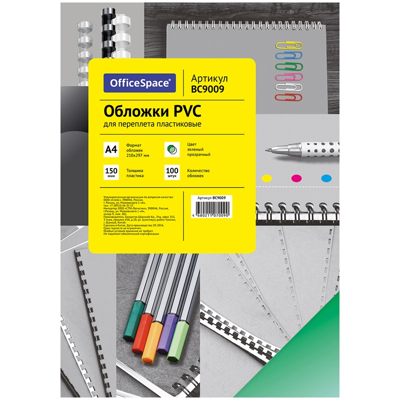 Обложки для переплета пластиковые OfficeSpace BC9009 PVC зеленые, тонированные, А4, 150 мкм