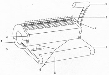 Перечень деталей: 1. Гребёнка2. Открывающие крючки 3. Корпус 4. Регулятор глубины 5. Регулятор отступа 6. Ниша для перфорации 7. Станина 8. Поддон для отходов перфорации 9. Рычаг перфорации